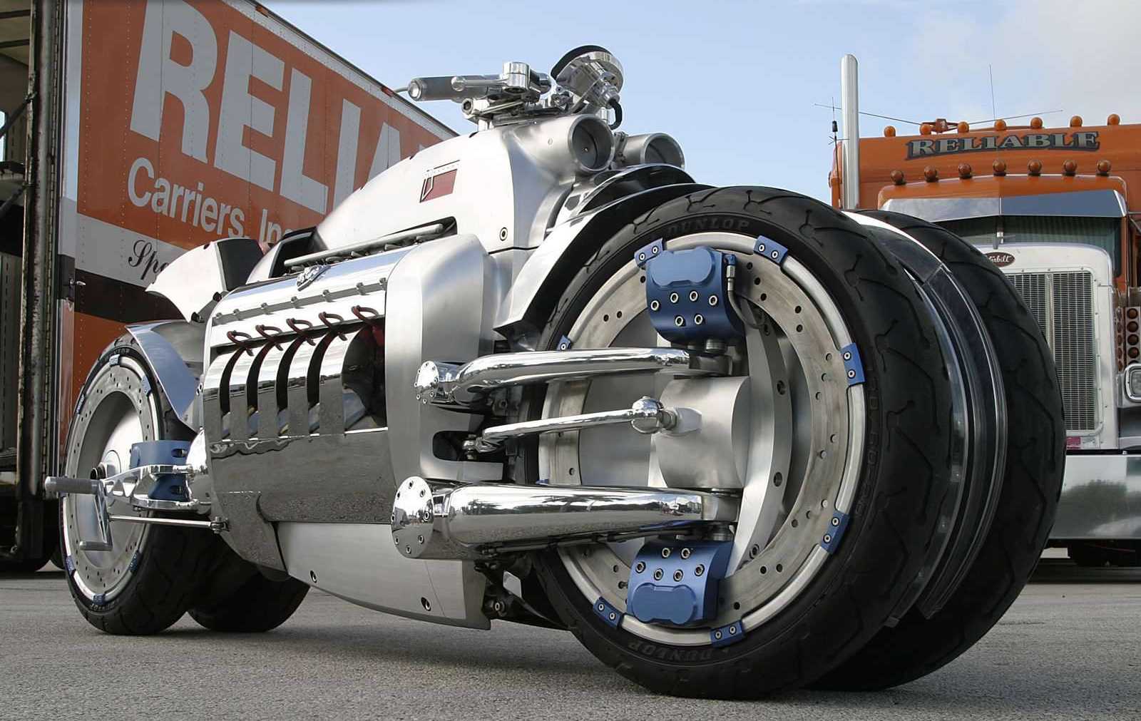 Dodge Tomahawk – это концептуальный прототип с заявленной максимальной скоростью 468! км/ч. Достигается такая авиационная скорость благодаря десятицилиндровому 500-сильному мотору от Dodge Viper. Данный победитель рейтинга «Самый быстрый мотоцикл» имеет спаренные передние и задние колеса. Такое количество колес придает этому средству передвижения хорошую устойчивость. В конструкции этого мотоцикла используется титан, карбон, алюминий и магний. Снаряженная масса «Томагавка» — 680 кг. По заявлениям, инженеров компании – производителя 468 км/ч – не предел. По мнению специалистов он может развить запредельные 613 км/ч!
