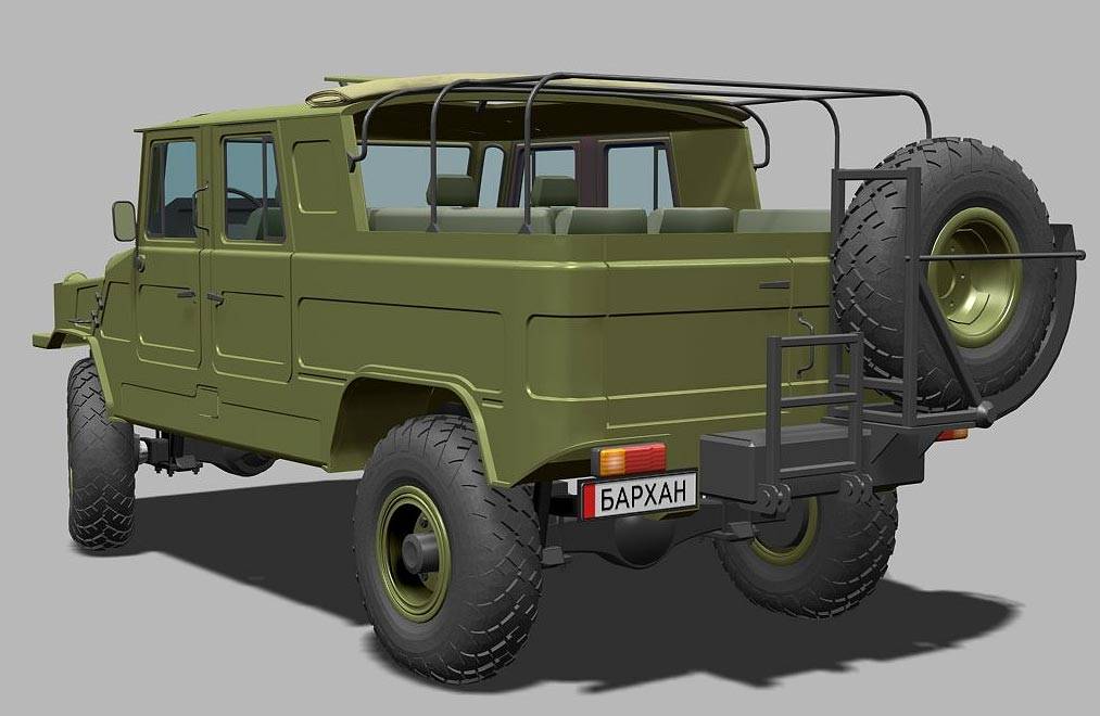 Как и положено военной машине она оборудована лебедкой, системой подкачки колес, мощным буксирным устройством. Отделка кузова предельно «спартанская» — моющийся «кож-зам» и пластик… Предусмотрена и «десантная»модификация «Бархана». У машины съемный брезентовый верх, рамка лобового стекла может ложиться на капот, вместо дверей брезентовые шторки.