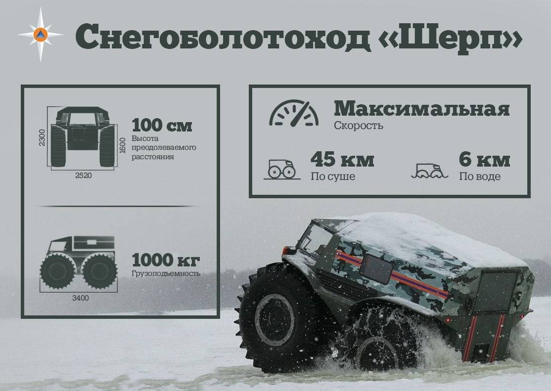 Вездеход-амфибия российского производства «Шерп» эффективно решает оперативные задачи подразделений МЧС, разведывательных и медицинских служб. С его помощью возможно оказание помощи в труднодоступных районах, включая болотистые местности.