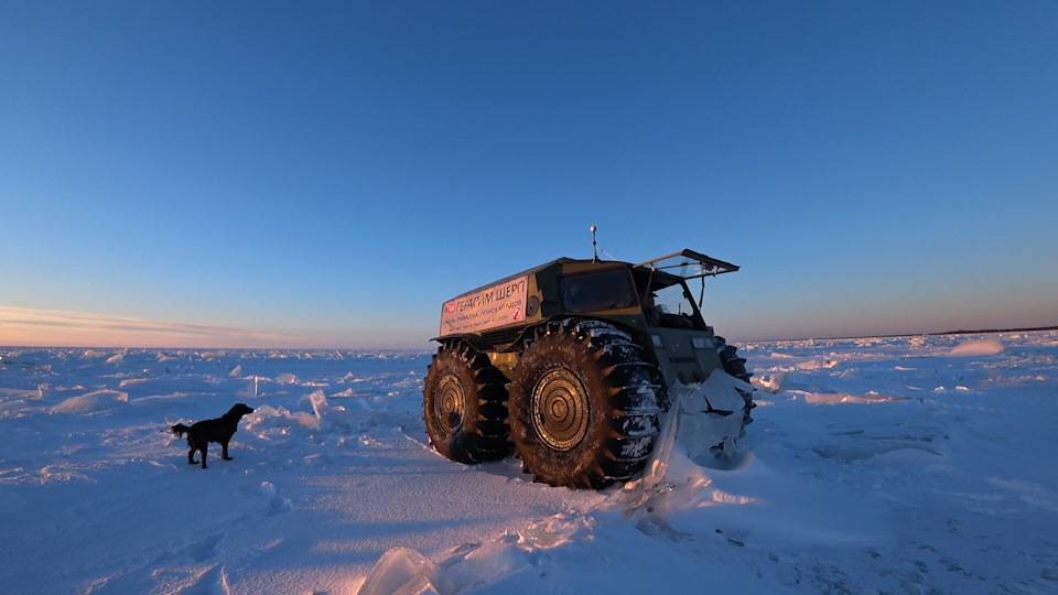 Колеса вездехода Шерп очень большие по размеру, они имеют диаметр 1,6 метра, ширина колеса 60 см. Именно благодаря таким большим колесам вездеход Шерп прекрасно плавает по воде.
