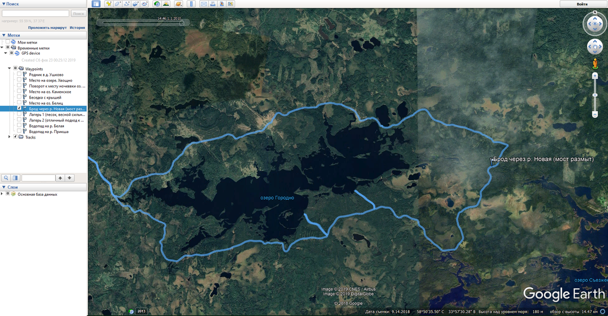 Фрагмент моего майского трека к озеру Городно в Google Earth Pro. Слева можно выбирать точки маршрута и просматривать их описание. Хотя брода и реки из-за деревьев на карте не видно, по описанию точки сразу понятно, что брод там есть
