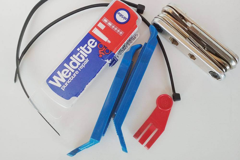 Моя велоаптечка за 700 Р: пластиковые хомуты, набор для заклейки камеры, монтажки для съемки и установки покрышки, мультитул и заглушка тормоза. Она нужна для того, чтобы при снятом колесе случайное нажатие на рычаг тормоза не привело к заклиниванию тормозной колодки