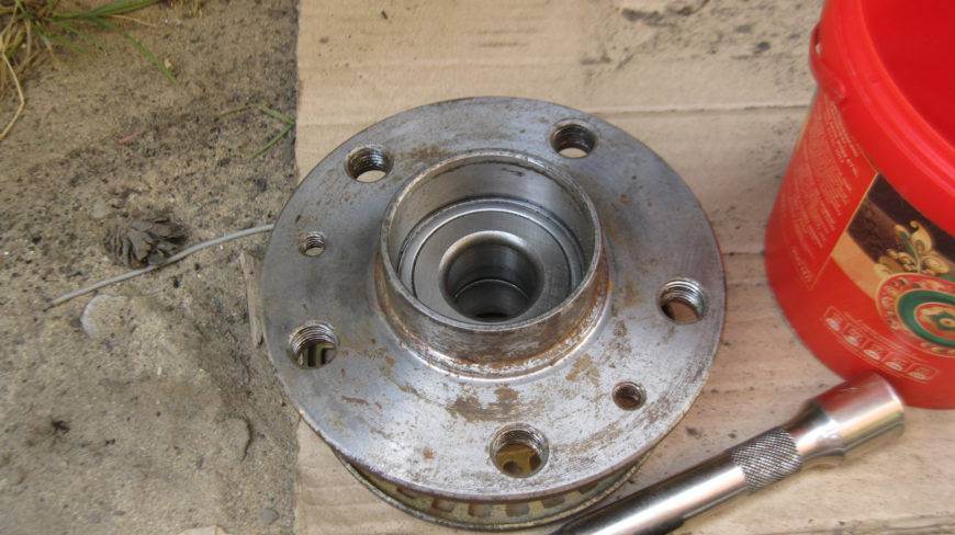 Аналогично выбивается и другой подшипник, после чего необходимо промыть и прочистить внутренние поверхности колеса. После очистных процедур можно приступать к установке новых подшипников.